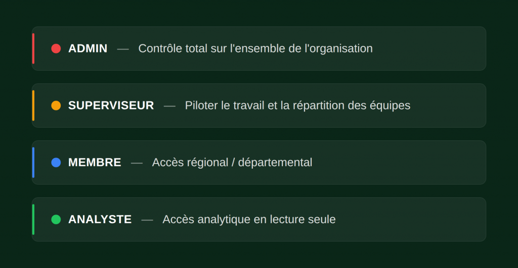Le rôle de Superviseur fonctionne comme un Admin périmétré. Il dispose d’un contrôle opérationnel complet, gestion des QR codes, supervision des membres de l’équipe et distribution des tâches, mais uniquement dans le périmètre qui lui est attribué (département, région ou compte client). Les paramètres globaux comme la facturation et le SSO restent réservés aux Admins.